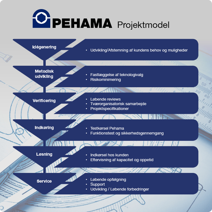 Vi anvender en velafprøvet projektmodel i forbindelse med kundespecifikke løsninger. Gennem projektmodellen anvender vi enkle metoder og værktøjer der skaber overblik over netop dine idéer og løsninger.